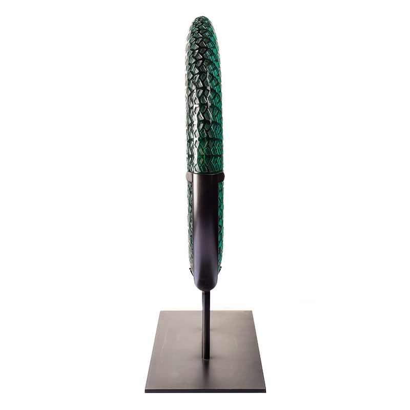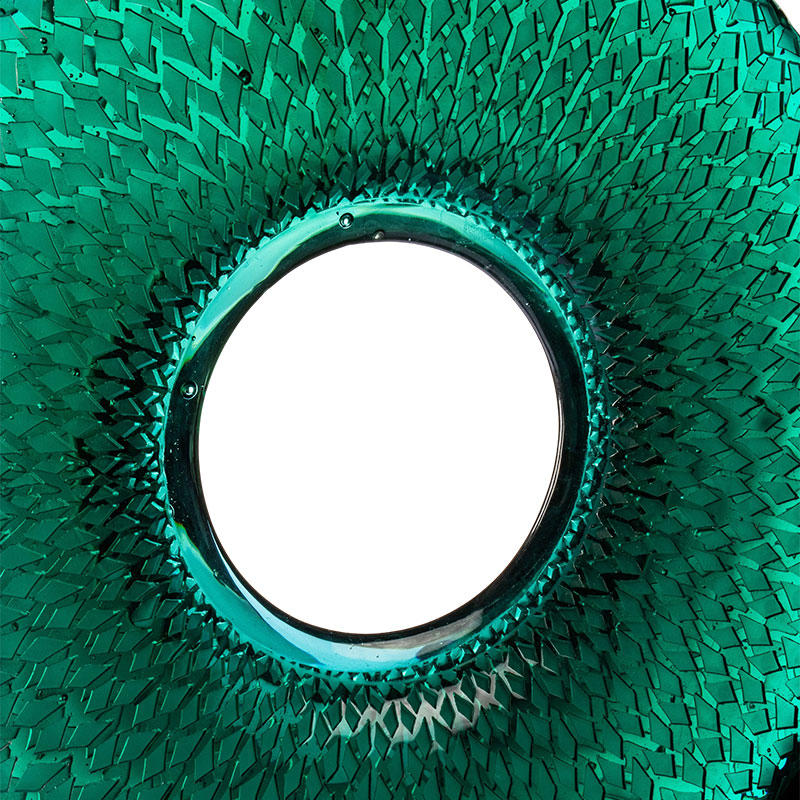 Çalışma, orman melteminde sallanan yemyeşil bambuların ruhani ruhunu yakalayan, doğal ilham kaynağı olarak bambu yapraklarını alıyor. Camın yarı saydamlığı sayesinde binlerce parıldayan bambu yansımasını çağrıştırıyor. Yemyeşil mavinin bu tonu, hem sabah çiyi buharlaşmadan önce bambu bahçelerinin tazeliğini hem de zamanın geçişinin yumuşak zarafetini temsil ediyor. Bambu yaprağı damarları gibi karmaşık desenler, yüzeyde dans ederken ışık katmanlarıyla dalgalanıyor ve dairesel çerçeve içinde vahşi dağ ruhunu yakalıyor.