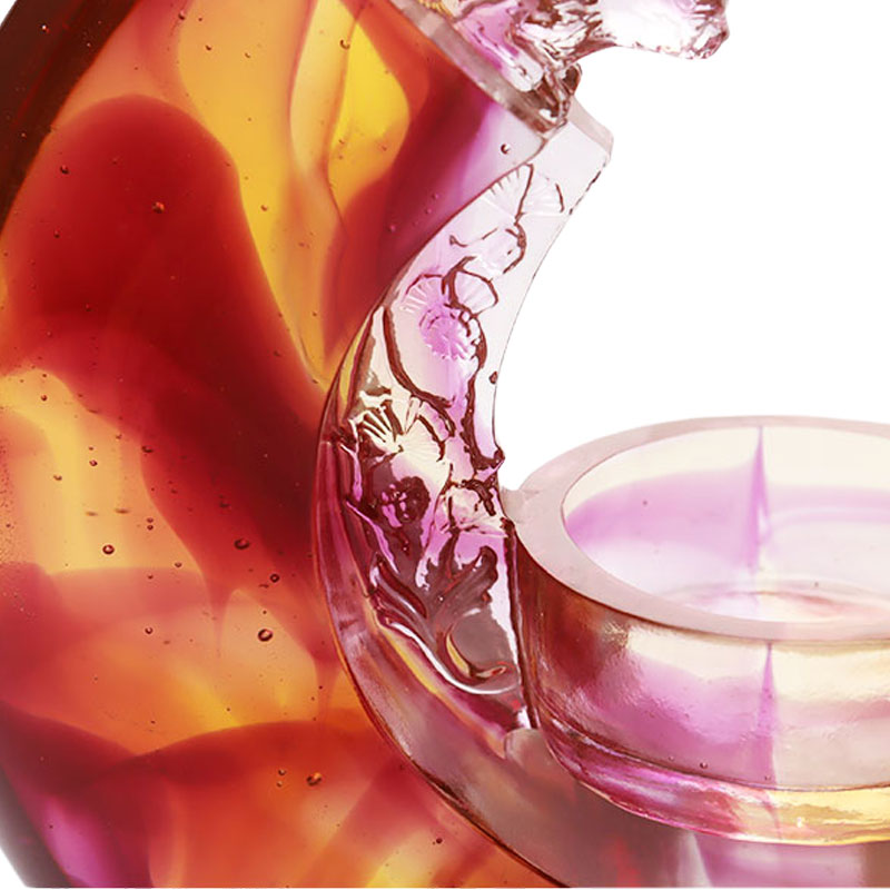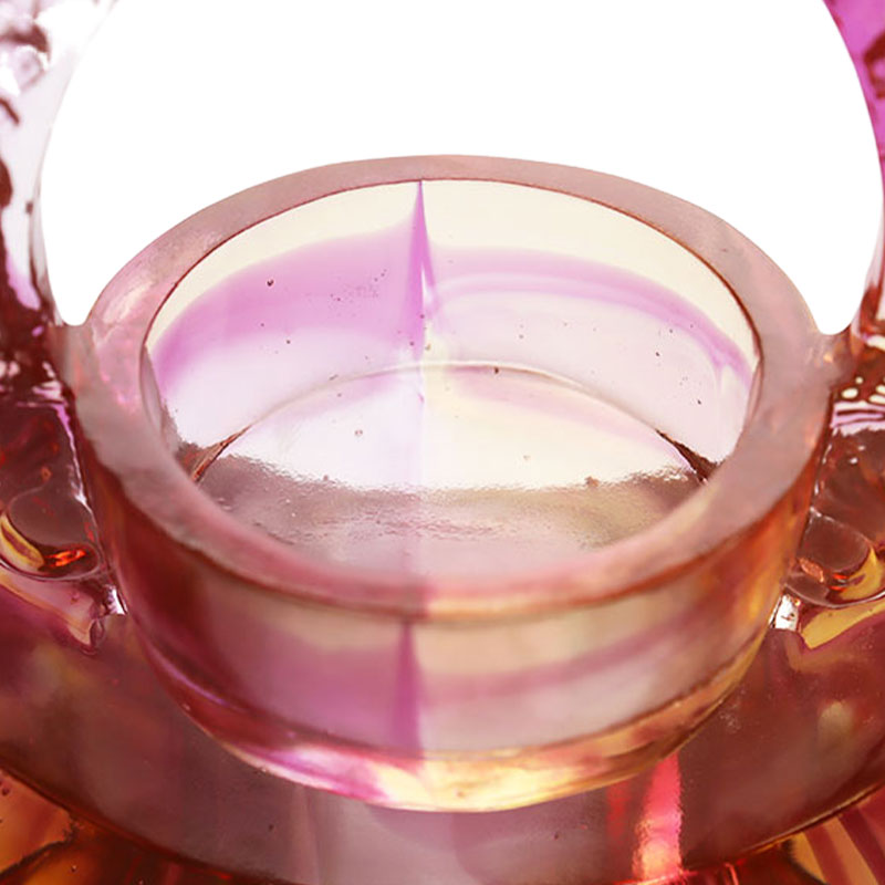 Renkli sır malzemesi şamdana rüya gibi bir doku kazandırır. Renkleri gün batımı kadar muhteşem. Kırmızı, sarı ve mor renkler birbirine karışıyor, akan renkler bu muhteşem anda sanki zamanı donduruyor. Her rengin geçişi doğal ve pürüzsüz olup, renkli cilanın eşsiz çekiciliğini gösterir. Şamdanın şekli, her iki tarafında hilal benzeri bir tasarım, pürüzsüz çizgiler ve gerginlikle sanki zarif bir ritim anlatıyormuş gibi ustaca tasarlanmış. Üst kısımdaki zarif oymalar, mum ışığını koruyan elfler gibi narin ve canlıdır, tüm şamdana gizem ve çeviklik duygusu katar. Mumun yerleştirildiği orta kısım zarif bir şekilde tasarlanmış, hem pratik hem de güzel ve arzu edilen bir şekilde genel şekle entegre edilmiştir. Zanaatkarlık açısından bakıldığında, bu renkli sırlı şamdan çok yüksek düzeyde bir üretimi temsil ediyor. Renkli sırın şeffaflığı ve parlaklığı ekrana getiriliyor ve her ayrıntı en ufak bir kusur olmadan tam olarak işleniyor. İster şamdan olarak kullanılsın ister bağımsız bir sanat eseri olarak sergilensin, sarhoş edici bir çekicilik yayabilir ve renkli sır sanatının benzersiz değerini vurgulayabilir.